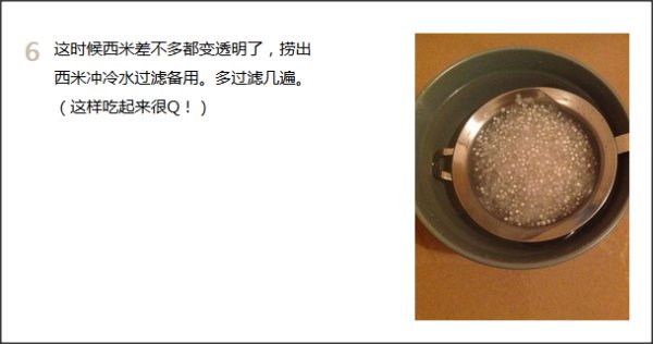 3,继续焖一会:如果煮到西米完全透明,口感就不会那么Q,所以应该在还有一点点白芯的时候就关火,然后盖上盖子继续焖5-10分钟至完全透明口感才会最好,煮好的西米要彻底用冷水冲凉过滤干净。