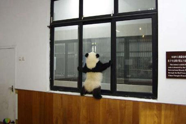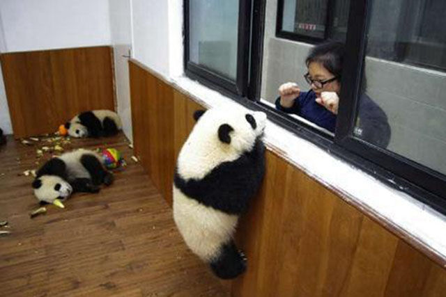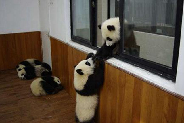 「熊貓寶寶爬窗記」發生在成都的夏天,從照片上看,大熊貓寶寶試圖爬窗台,與飼養員互動,真正的原因讓人好笑,是因為熊貓寶寶被關在房間內,牠們是在試圖逃跑,但是牠們並不知道窗戶外邊的飼養員不會讓牠們離開房間的。