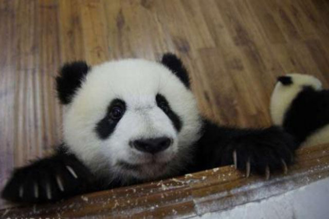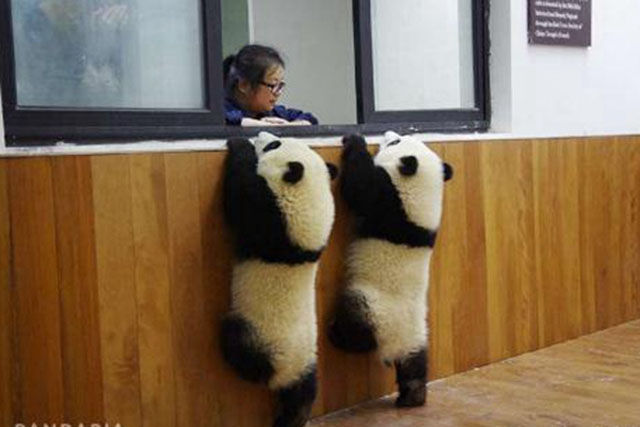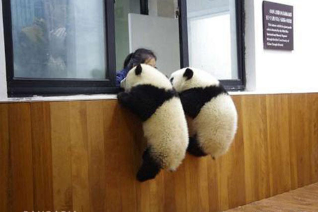 兩隻熊貓寶寶爬窗台,目的是為了逃跑,但忽視了飼養員在窗外,讓人笑噴。(網絡圖片)