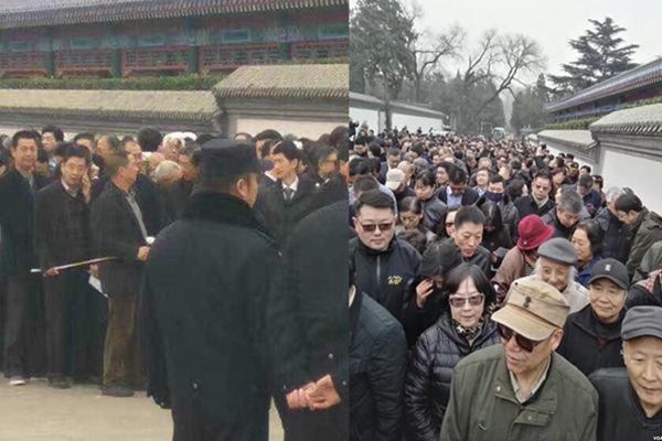 送葬人群中有94高齡的社科院離休研究員何方及夫人、歷史學者章立凡、作家王蒙、老鬼、原中紀委反腐專家李永忠等人。