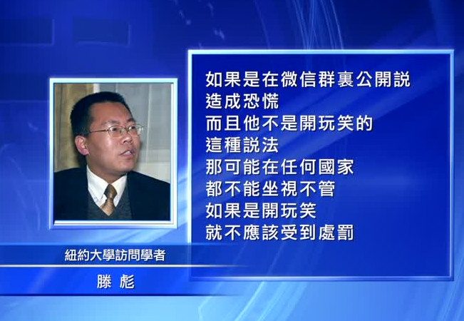 紐約大學訪問學者滕彪:「如果是在微信群裡公開說,造成恐慌,而且他不是開玩笑的這種說法,那可能在任何國家都不能坐視不管。如果是開玩笑,就不應該受到處罰,因為不違反任何法律,對社會也沒有任何危害。」