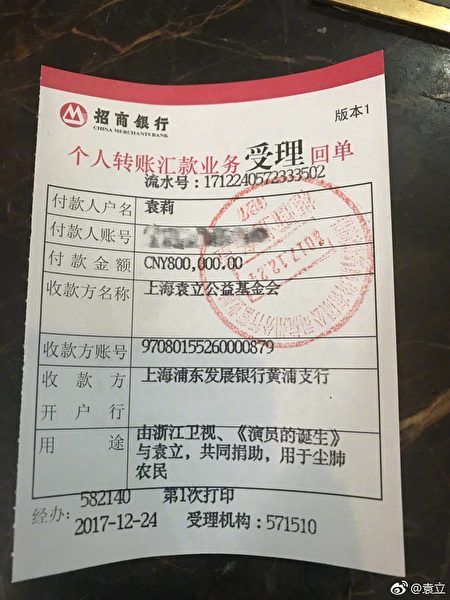 【新!唐!人:北京時間2017年12月26日訊】24日,大陸女星袁立(原名袁莉)貼出捐款80萬元人民幣的賬單。單據中的「用途」一欄寫道:「由浙江衛視、《演員的誕生》與袁立,共同捐助,用於塵肺農民。」該描述顯出袁立的較真和大氣,也打臉官方電視台。