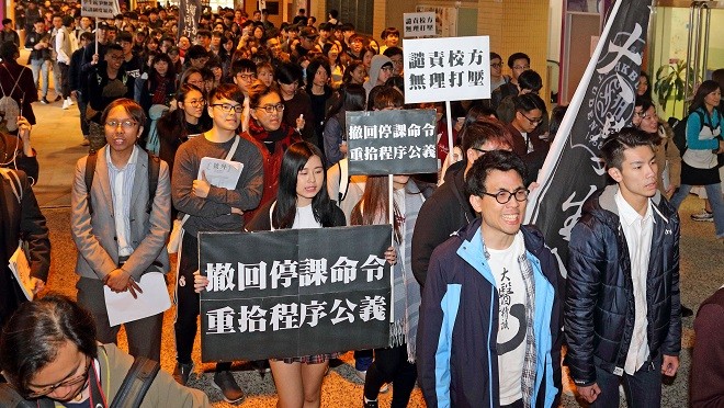 香港浸大學生會發起校內遊行,有數百名學生參與,包括其他大專院校的學生,他們反對浸大校方未經紀律委員會調查下,將參與抗議校方普通話豁免試評分機制的學生暫時停學,要求校方撤回決定。