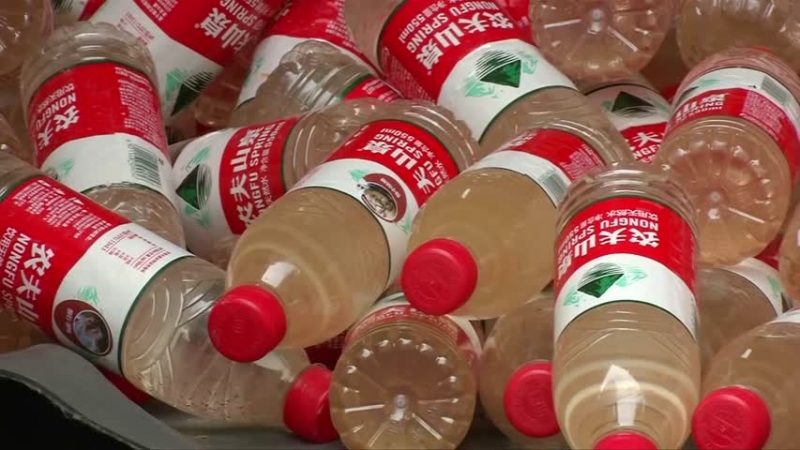 這些瓶裝水看起來和「農夫山泉」礦泉水一樣,但裡面的水怎麼有點兒發黃?