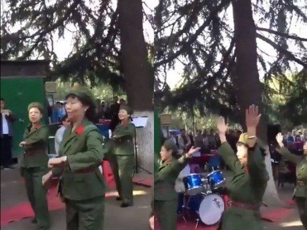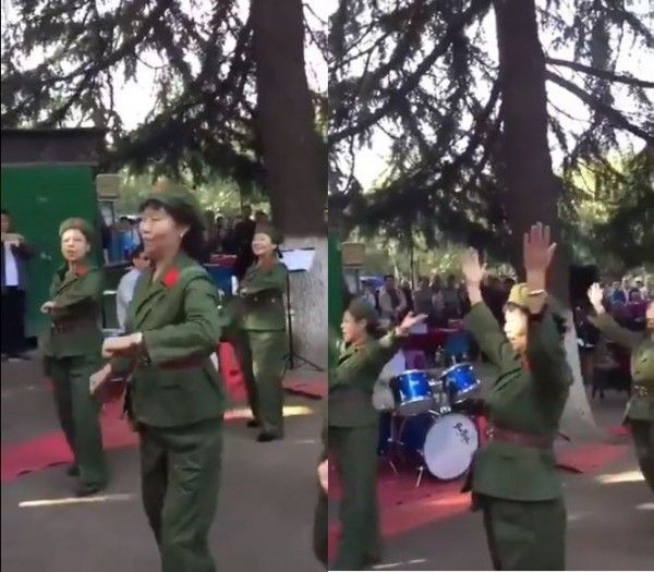 中國大媽9月30日聚集澳洲墨爾本,裝扮成中共文革時期的紅衞兵,一邊手舞足蹈跳文革舞,一邊嘴裏還念念有詞的讀歌詞,被中國網友評論為「邪靈附體」、「群魔亂舞」。(圖片來源:推特)