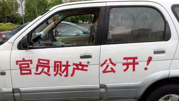 中國南京市民秦滬輝在私家車上貼「官員財產公開」等標語,被當局以尋釁滋事罪刑事拘留,警方其後更指稱她「危害國家安全」。(圖片來源:自由亞洲電台)