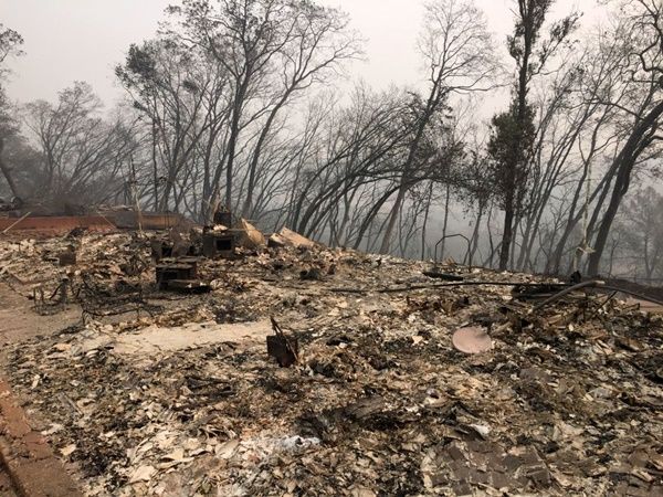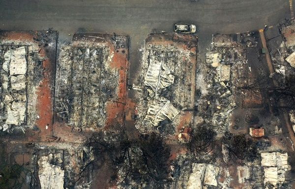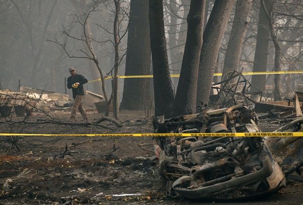 美國加州北部糟野火蹂躪的地區,處處是焚毀殘骸及嗆鼻煙霧。(Justin Sullivan/Getty Images)