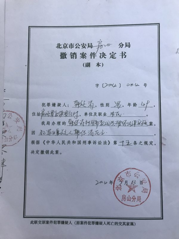 當時,只有兩位家人在北京公安監視下得以進入存放韓俊清遺體的房間,房間外面則被看守所人員團團圍住。