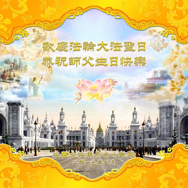 二零一九年世界法輪大法日來臨了。在偉大的正法中,師尊救度並造就了我們,也救度了無量穹體、無盡眾生於壞滅,賜予了我們未來圓容的成住不滅。弟子們與眾生對師父、對大法無比感恩之心亦是無以言表。在這穹宇同慶、萬眾感恩的聖日裡,全體法國大法弟子向慈悲偉大的師尊問好,恭祝師父生日快樂!
