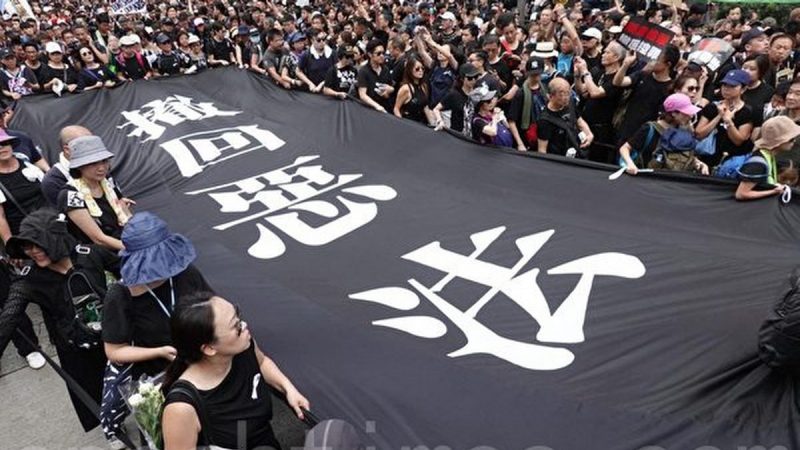 身穿黑衣,手持標語,香港民眾頂著高溫上街,他們追究香港政府的壓迫,更針對香港政府提出五大訴求,包括「不檢控示威者」、「撤回送中惡法」、「林鄭月娥下臺」、「取消定性暴動」、「追究開槍責任」等。