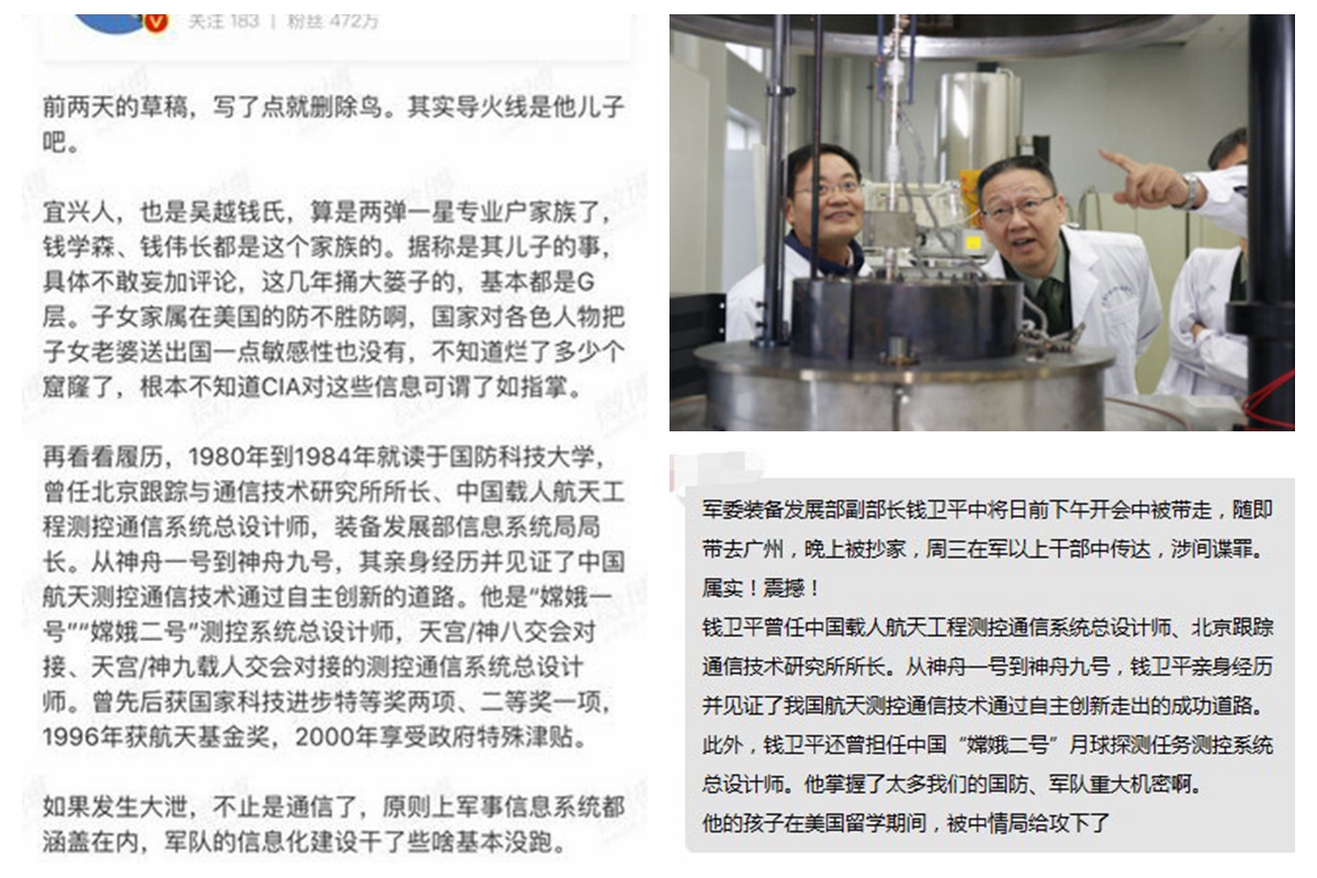 【新!唐!人:北京時間2019年07月06日訊】7月5日,社交媒體中熱傳,掌握登月計劃等機密的中共中央軍委裝備發展部副部長錢衛平,日前因涉間諜罪被帶走。錢衛平是少將軍銜,但傳聞稱其為中將,目前中共官方沒有證實這一消息。