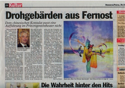 3月19日,保利先生接受了德國主流媒體、慕尼黑《南德意志報》採訪,介紹了中領館上門威脅的情況。他說:「我可不吃這一套,演出就是要照常進行,我們生活在一個自由的國度」。《南德意志報》以「中方想讓演出不成」為題報導了此事,曝光中共的陰謀。
