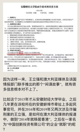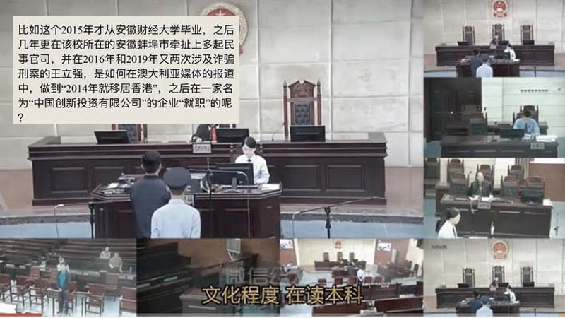 《環球時報》給出的視頻中,被告人還自稱出生於1993年4月18日,受審時「在讀本科」。報導的文字部份也聲稱,王立強2016年還是一名大學在讀學生。但翻查《環球時報》11月24日的一篇報導可見,當時其旗下自媒體「耿直哥」聲稱,「王立強2015年已從蚌埠市的安徽財經大學畢業」。