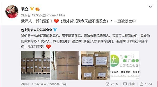 【新!唐!人:北京時間2020年02月06日訊】2月4日,大陸影星袁立在微博轉發「上海袁立公益基金會」給武漢捐贈制氧機的消息。其中說明:「我們第一批去武漢的制氧機,用於隔離在家、無法去醫院的病人。」發布該消息前,她發文道:「武漢人,我們愛你!」並透露發微博意在「試試我今天能不能發言」,因為她「一直被禁言中」。