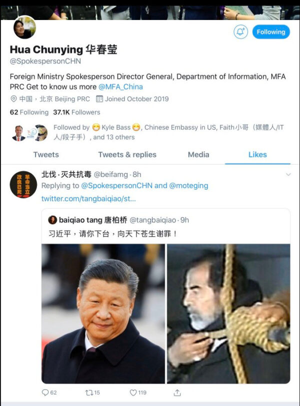 身為中共外交部發言人的華春瑩竟然在推特上為反習帖文點贊,這個發現立即在推特上的華人圈中引爆熱議。
