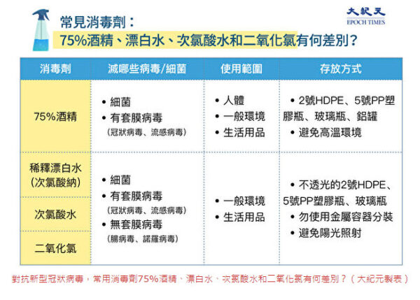 對抗新型冠狀病毒(COVID-19),居家消毒和給身體消毒都很重要。除了常見的75%酒精、氯系漂白水外,近來也出現了次氯酸水、二氧化氯等消毒產品。這些消毒劑都能夠有效對抗新冠病毒嗎?應如何正確使用?