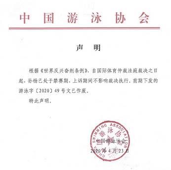 不到12個小時後,中國游泳協會迅速發表聲明稱,因為孫楊處於禁賽期,上述體育總局游泳字[2020]49號通知「已經作廢」。
