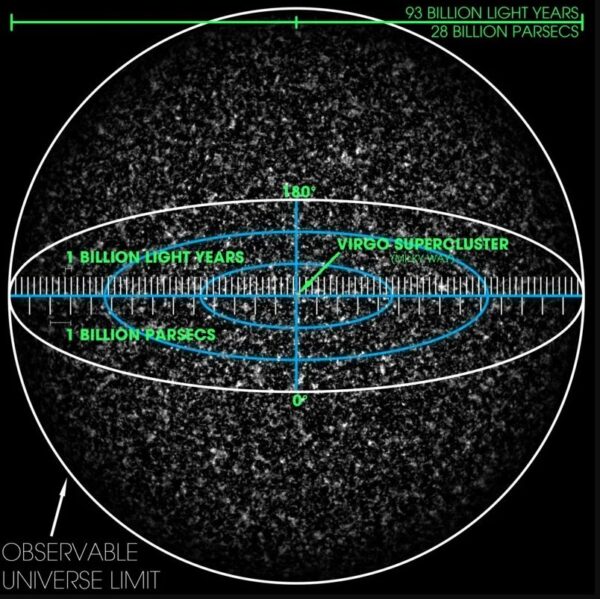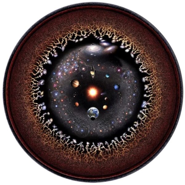 下圖是藝術家對可觀測宇宙的對數尺度構想圖,以太陽為中心,朝外是太陽系內行星和外行星,古柏帶,奧爾特雲,南門二,獵戶臂,銀河系,仙女座星系,鄰近星系,宇宙纖維狀結構,宇宙微波輻射以及處在邊緣的不可見的大爆炸電漿體。