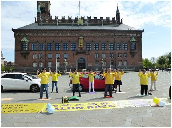 5月9日下午,丹麥部分法輪功學員在哥本哈根市政廳廣場上,擺放各種大法橫幅、圖片、真相資料,還準備了寫有「法輪大法好」字樣的氣球;隨著煉功音樂,向人們演示功法,慶祝世界法輪大法日。