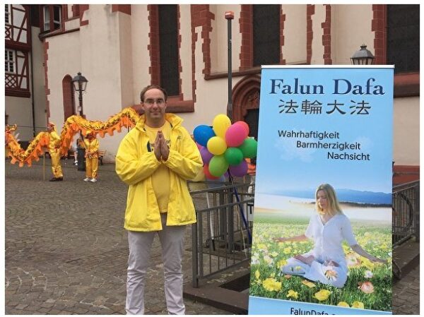他介紹說,2002年一天夜裡1點多鐘,他當時還是一名大學生,參加了一個派對後,走在中共駐柏林的大使館對面的橋上,看到法輪功學員在橋上舉行守夜抗議活動,他十分驚訝,接過一張傳單。回家後,他開始了解法輪功,當年就走上了修煉之路。
