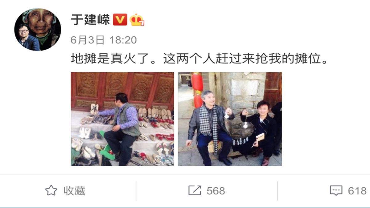 5月28日,中共兩會閉幕日,李克強在記者會上點讚四川成都的地攤經濟的同一天,于建嶸就在微博上貼了多張自己擺地攤的圖片,賣鞋,賣手工藝品,買小吃。