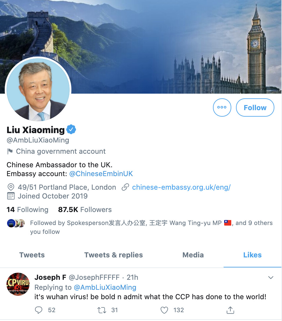 【新!唐!人:北京時間2020年09月16日訊】繼點讚色情視頻風波後,中共駐英國大使劉曉明9月13日再點讚一條直呼「武漢病毒」、要求中共認罪的推特留言。有網友調侃,劉曉明「這是要叛逃的節奏」。