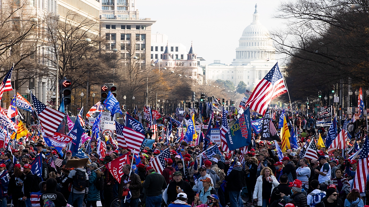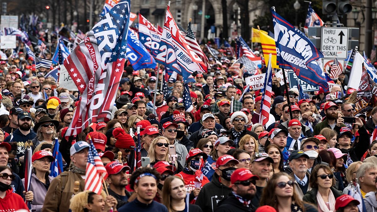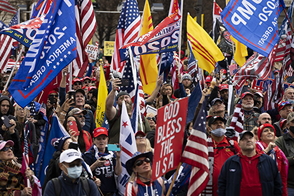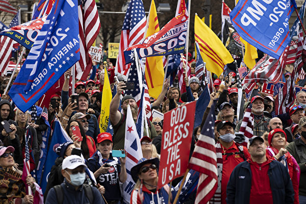 12日華盛頓DC舉行了「停止竊選」大型集會遊行活動中,各地民眾高舉「為川普而戰(Fight For Trump)」、「讓美國再次偉大(Make America Great Again)」等橫幅及美國國旗,不停高呼「USA」和「停止竊選(Stop the Steal!)」。