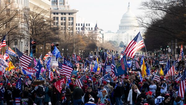 在集會開始前,民眾成群結隊,身披美國國旗,手持支持川普、抗議選舉欺詐的各式各樣的橫幅和標語,在國家廣場周圍遊行。