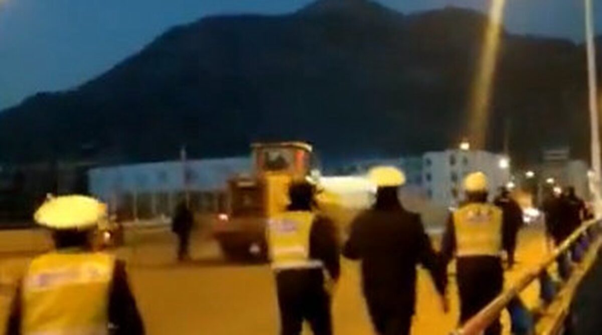 昨天傍晚7点半左右,在泰安迎胜路5泰山大街交汇处。官逼民反。有人开着铲车冲上街头, 朝市政府方向开去。警察和特警一起出动拦截。