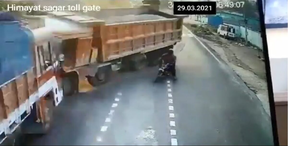 【新!唐!人:北京時間2021年03月31日訊】印度海德拉巴(Hyderabad)29日發生一起驚悚車禍,一名機車騎士看到一輛砂石車急駛而來,卻執意從路旁要進入車道,砂石車司機為了要閃避他而轉向,卻撞上對向的大貨車,導致3人受傷,釀禍騎士也遭逮捕。