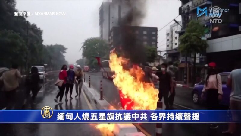 緬甸民眾焚燒中共五星旗,表達自政變以來,對北京的不滿。原來北京當局不干涉、不制裁的立場,對緬甸人來說,就是幫兇,日前中共駐聯合國大使張軍反對聯合國制裁緬甸軍政府的舉動,更是引爆緬甸人怒火,戴著「反中共噤聲聯合國」的面具,表達不滿。