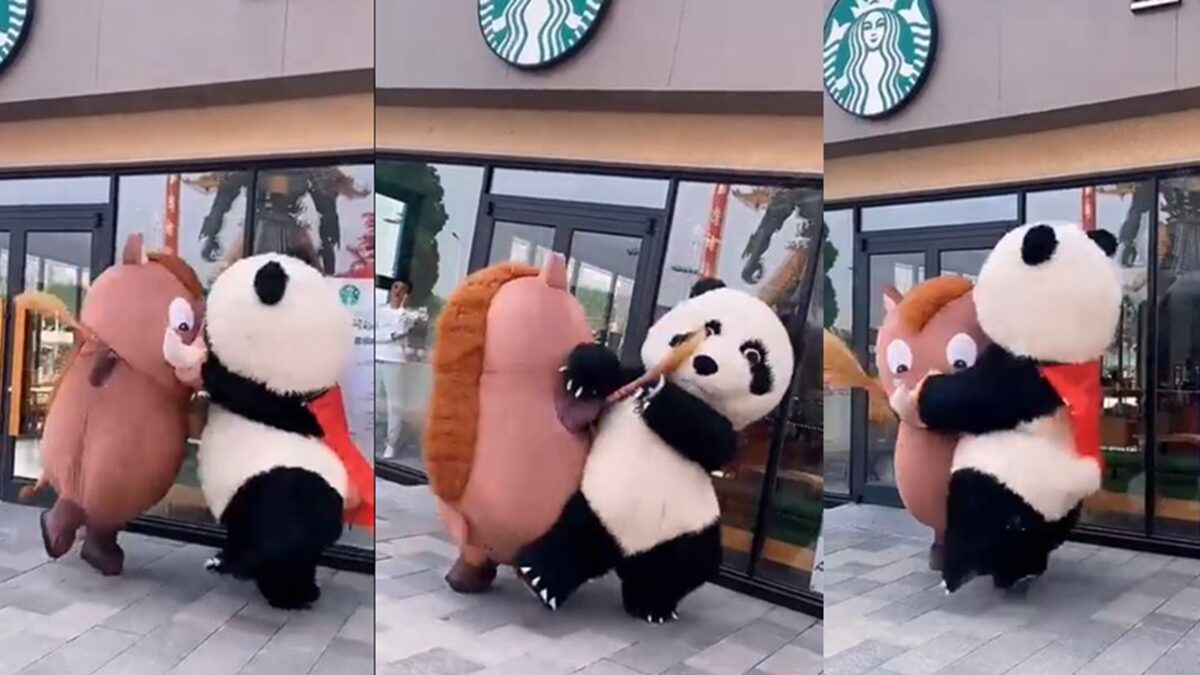 畫面顯示,「熊貓」和「野豬」抱在一起,打得不可開交。只見「熊貓」不斷向「野豬」踢出小短腿,「野豬」則手持掃帚,狂掃「熊貓」,眼看著「熊貓」像是落了下風。