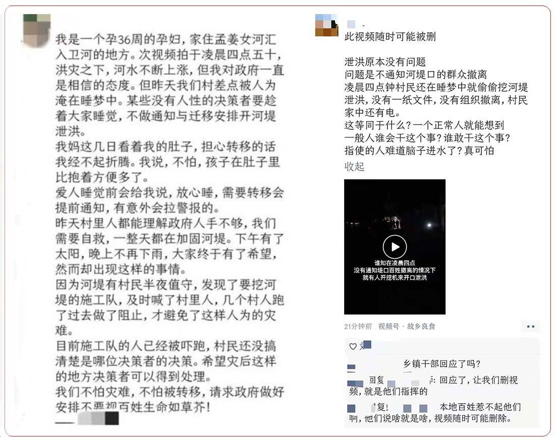 據自由亞洲電台報導,新鄉市一名孕婦在微博上發布視頻指,她所在村莊位於孟姜女河匯入衛河的地方。21日凌晨4點50分,河水在不斷上漲,在河堤值守的村民發現有施工隊準備掘堤,幸虧及時喊人阻止,才避免了全村人被淹在睡夢中的悲慘狀況。