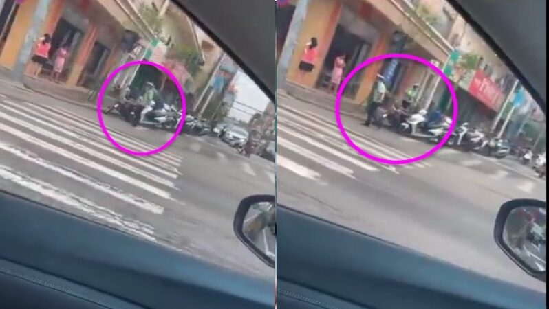 最新有視頻顯示,該男子砍殺一名交警後,又騎車追趕已逃跑的交警,追至警車旁時,逃跑的交警已在警車裡。交警見狀,趕緊開車逃跑,該男子則繼續追趕。