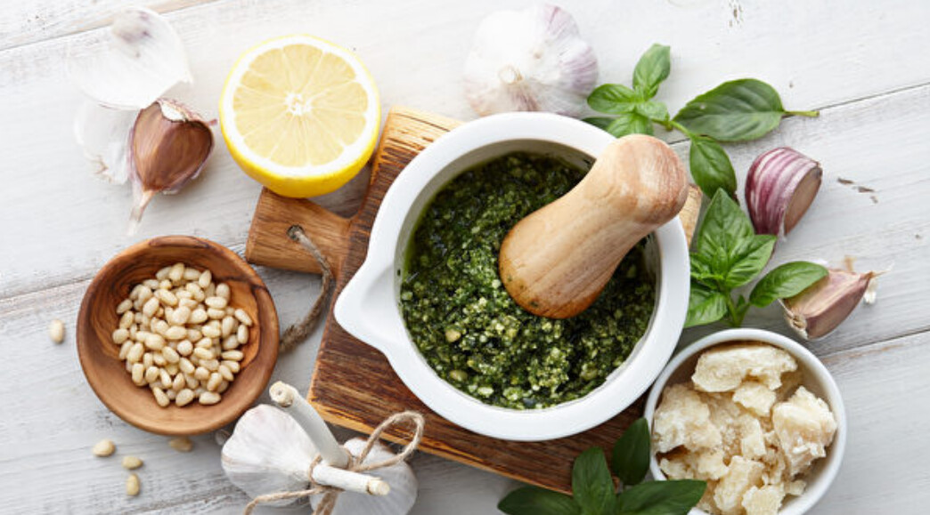 製作香蒜醬的基本食材有松子、蒜頭、帕馬森起司、羅勒葉、檸檬汁,你可以依據自己的口味,斟酌取用份量。然後將食材全部放入調理機進行磨碎。最後,淋上芳香滑順的橄欖油攪拌均勻,也可以加入適量的鹽、胡椒進行調味,就大功告成了!