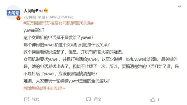 微博網友「大問號Pro」說:「這個通告看似說清楚了,但是,並沒有解答大家的疑慮。女司機說要找yuwei,並且打電話給yuwei。這至少說明,她和yuwei比較熟。最關鍵的是,她的電話都撥出去了,貌似不止撥了一次。所以,要搞清楚她的電話打給了誰,是不是打給了yuwei,應該很容易搞清楚吧?難道,大家要玩一輪猜猜yuwei是誰的全民遊戲?」
