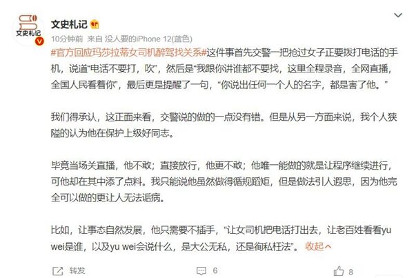 她態度傲慢,拒絕檢測,並多次對交警說「叫yu wei過來」,還試圖撥打手機,被一名交警阻止。(點擊觀看視頻)
