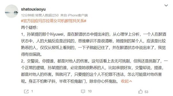 「shatouxiaoyu」提出兩個疑惑:「1.孫某提的那個叫yuwei,是在醉酒狀態中提出來的,從心理學上分析,一個人在醉酒狀態中,人的大腦反應是遲鈍的,思維意識不是很清晰,她提到的某個人,應該是比較熟悉的人,僅僅從報紙上看到的,一下子就能記住了,並在醉酒狀態中說出來了,我覺得有些蹊蹺。」