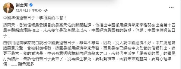 「告訴他們苦日子要來了,別再醉生夢死,要勒緊褲帶,面對未來割韮菜,要有心理準備。」謝金河在貼文中寫道。