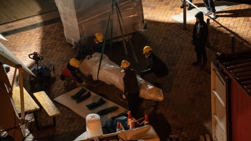 22日晚間10點到23號清晨,多名工人進入香港大學校園,將悼念六四天安門事件的藝術品「國殤之柱」封包裝櫃,並在23號上午7點,把「國殤之柱」裝上貨車,運離香港大學。