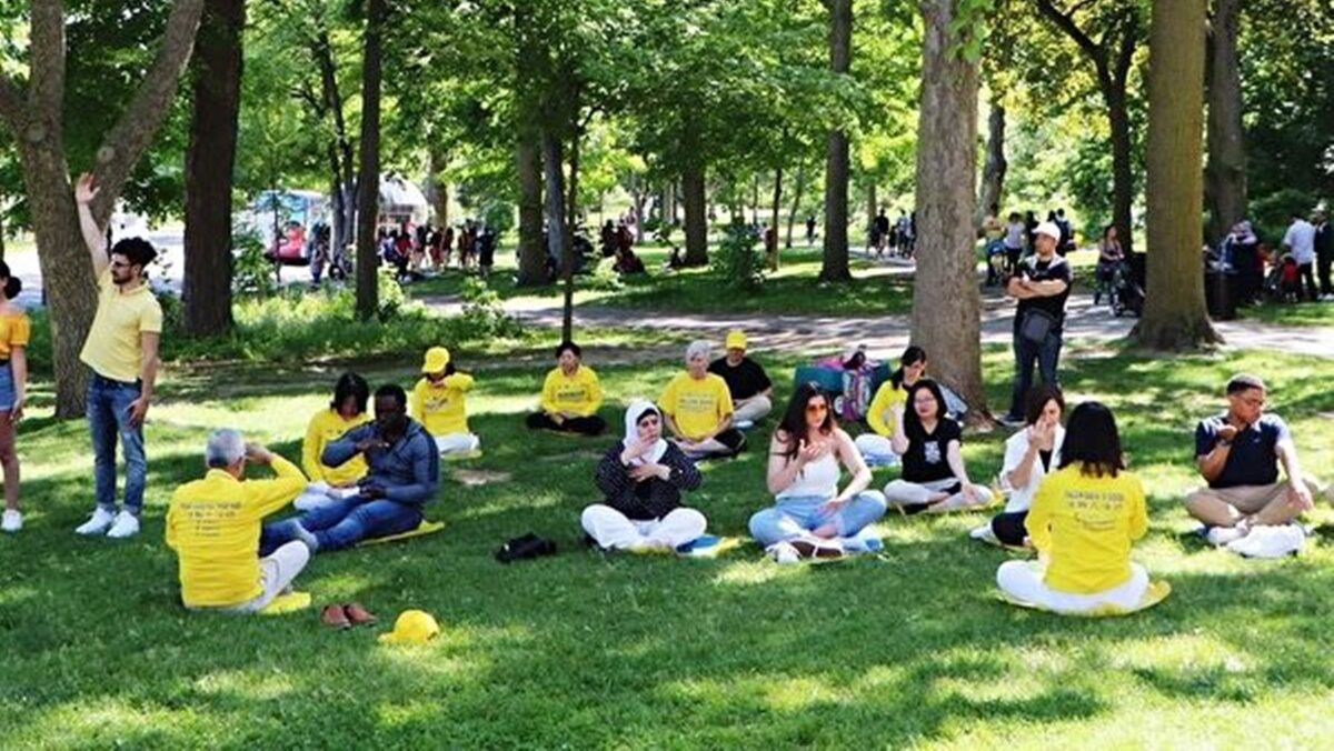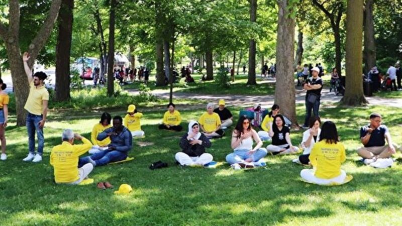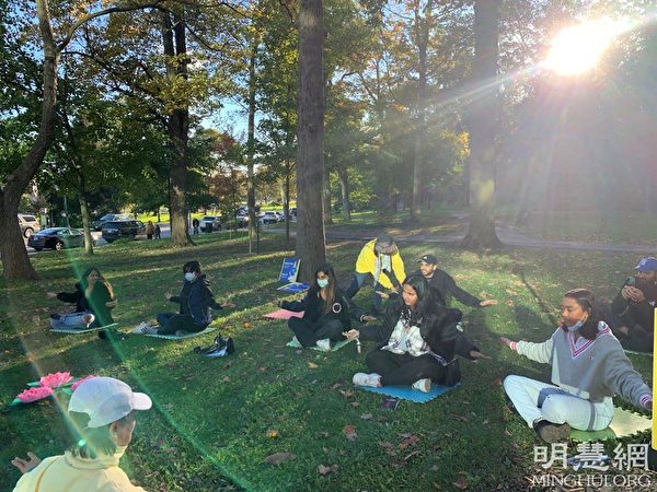 他們在草坪上伴隨著優美舒緩的音樂煉功,遊客們駐足觀看,有的學煉,有的說受神的啟示來到他們身邊。警察們時常在一邊興致勃勃地看著他們煉功。