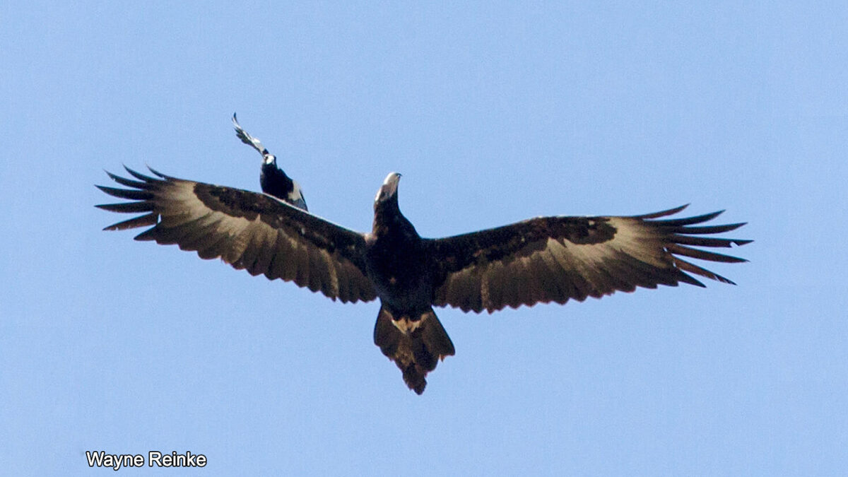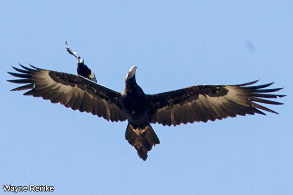 一天清晨,65歲的韋恩‧萊因克(Wayne Reinke)在昆士蘭州古納爾達(Gunalda)鎮尋找拍攝機會時,忽然看到他最喜歡的鳥類之一楔尾鷹正遭到一隻喜鵲的「騷擾」。