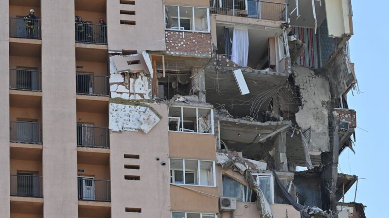 幾個公寓單元樓的外牆幾乎都被炸毀,內部變黑,碎片散落。爆炸後引起的煙塵在空中飄散。
