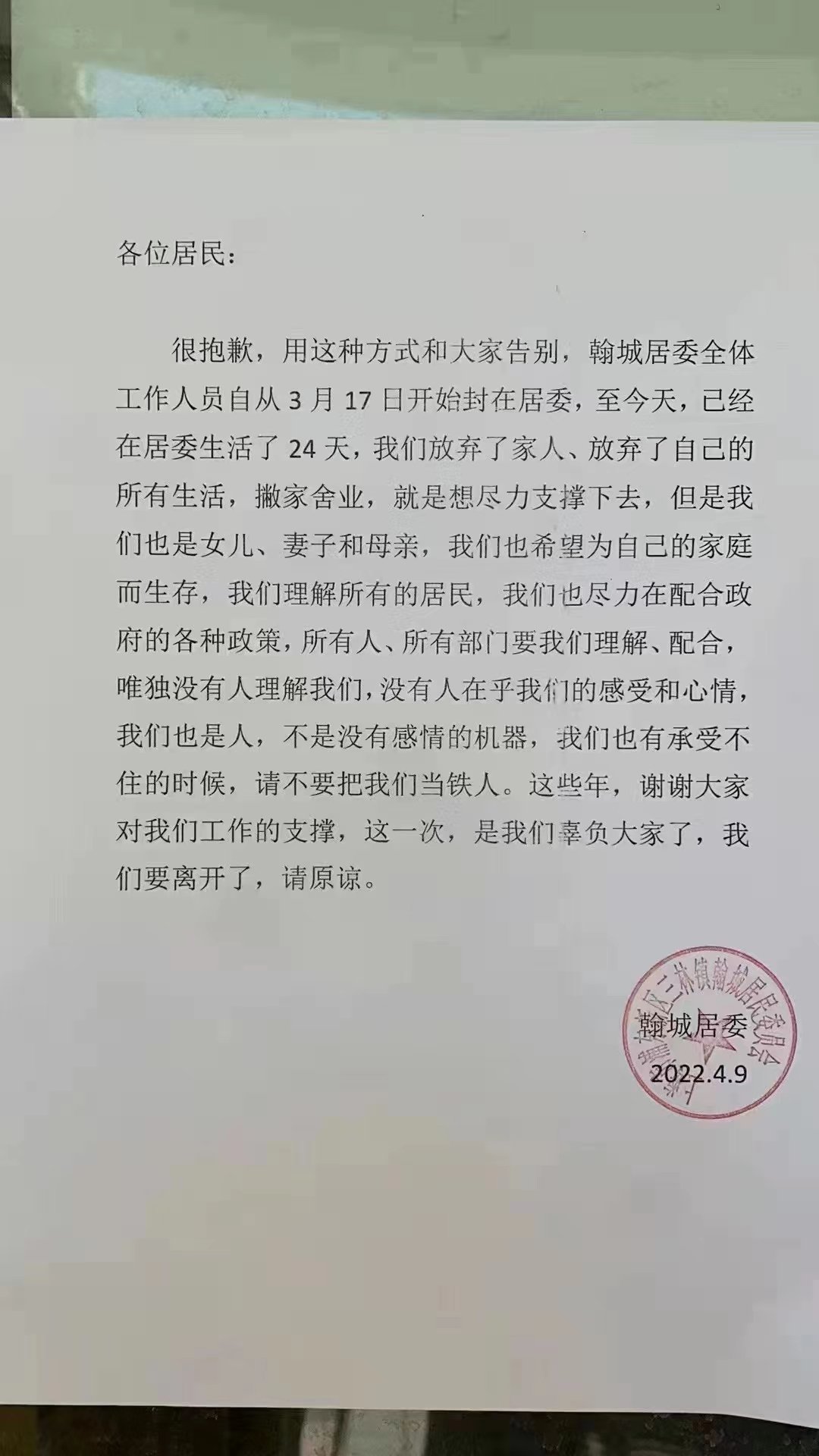 通知告訴居民,居委會全體人員3月17日就被封在居委,已撇家捨業強撐24天,期間所有人、所有部門都要求她們理解、配合,但沒有人理解她們,她們也是人,也要生存,因此不得已選擇離開。