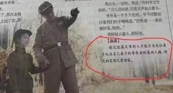 公眾號「常識流通處」為此發表了一篇評論文章,題為《恐怖的語文教輔材料:請你們不要擊穿人倫的底線》。文章稱,《語文導刊》上刊載的《紅蓋頭》文末,編者還加了一段「品讀」,把爺爺當年親手槍殺奶奶的行為形容為「偉大的家國之愛」、「革命者的高尚人格」。等等。