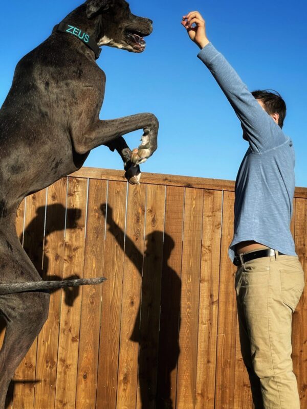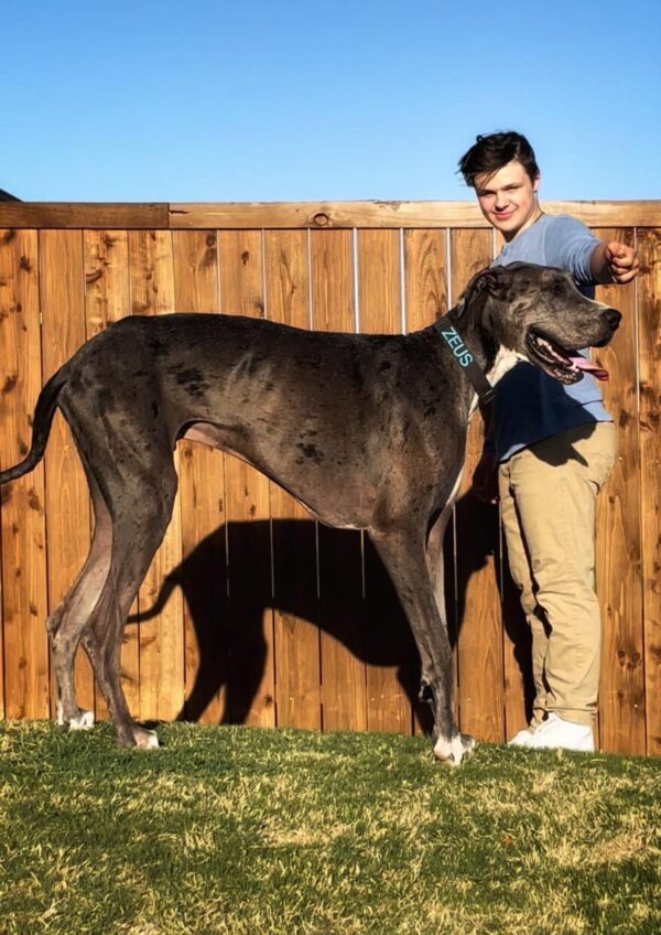 大丹犬平均身高為93厘米,最初在歐洲繁殖是用於獵野豬和保護主人安全,當仕女乘坐馬車時,大丹犬跟在馬車旁邊跑,因為它的身形巨大,令歹徒見之喪膽。不過宙斯不需要做這類工作,它的個性很溫和,每天在院子裡跑跑步,和家裡另外三隻狗和一隻貓玩樂。