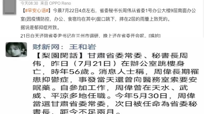 「甘肅祕書長」則是指7月24日《甘肅日報》報導的甘肅省委常委、省委祕書長周偉。報導稱,周偉因病於21日晚死亡,終年56歲。