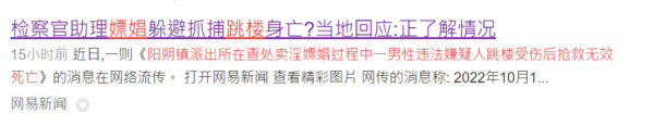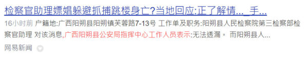 「網易」一篇題為《檢察官助理嫖娼躲避抓捕跳樓身亡?當地回應:正了解情況》的文章報導,對該消息,廣西陽朔縣公安局指揮中心工作人員表示「無法透露」。