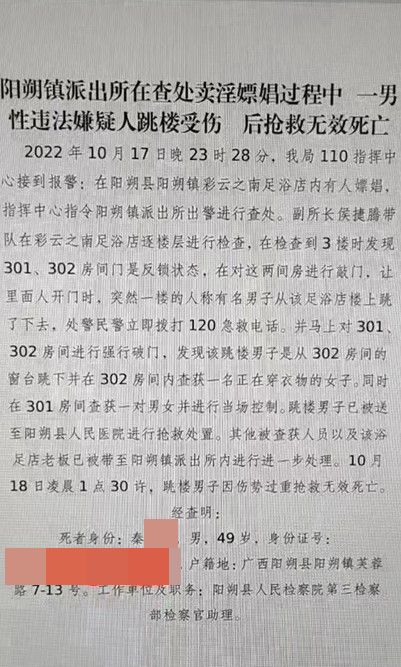 網傳的一份桂林陽朔縣公安局內部通告稱, 10月17日晚23時28分,陽朔縣陽朔鎮彩雲之南足浴店內有人嫖娼,陽朔鎮派出所出警進行查處。該派出所副所長帶隊在足浴店檢查時,發現3樓的301號、302號房間門反鎖,警方對兩間房間敲門時,突然一樓的人稱一名男子從足浴店樓上跳了下去,於是破門進去,發現該男子從302房間的窗台跳下去,並在該房內查獲一名正在穿衣的女子。此外,在301房間內的一對男女被抓。