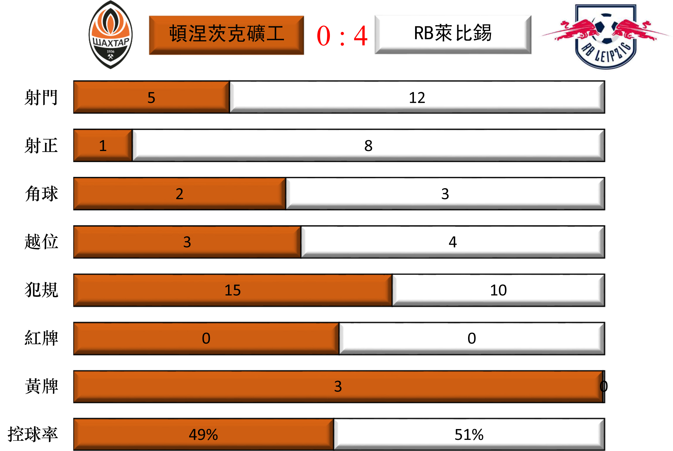 這個比分一直保持到終場。頓涅茨克礦工隊主場作戰,全場只有5次射門,1次射正;而RB萊比錫隊有12次射門,8次射正。主隊完全不在狀態,最終只能排名小組第三,進入歐聯盃的淘汰賽。